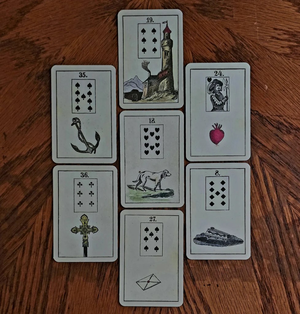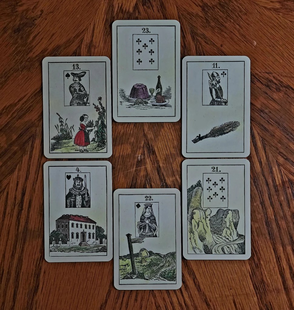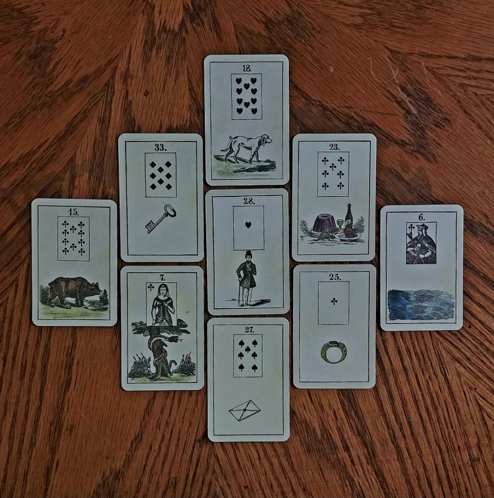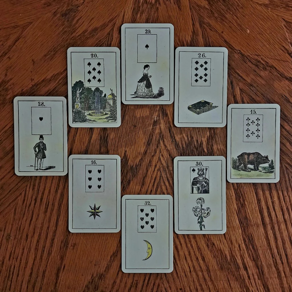 I offer an array of personally developed card spreads using Lenormand Cards to look into a single question on the behalf of the client—ranging from a 1 card pull, to 9 card tableau.