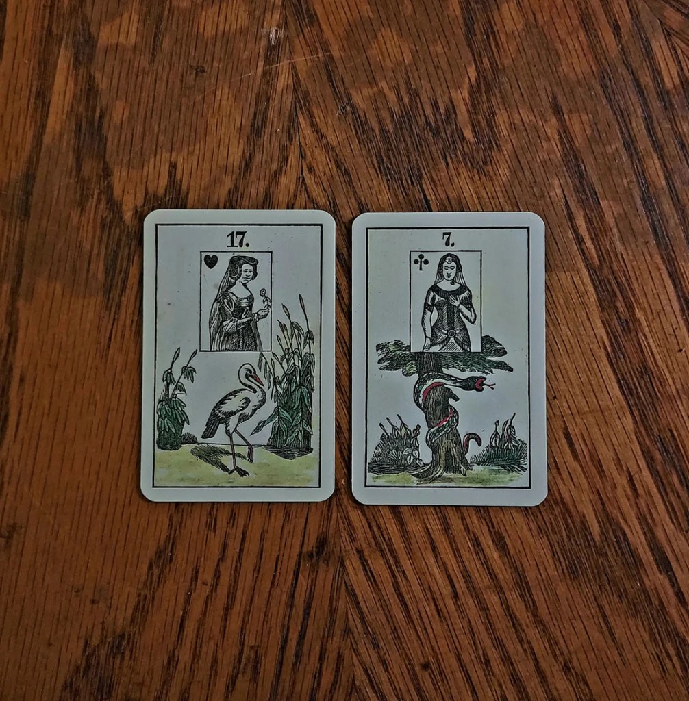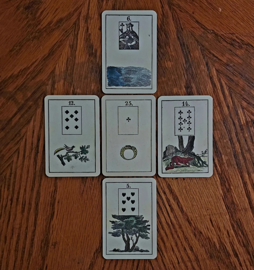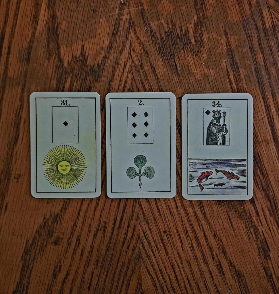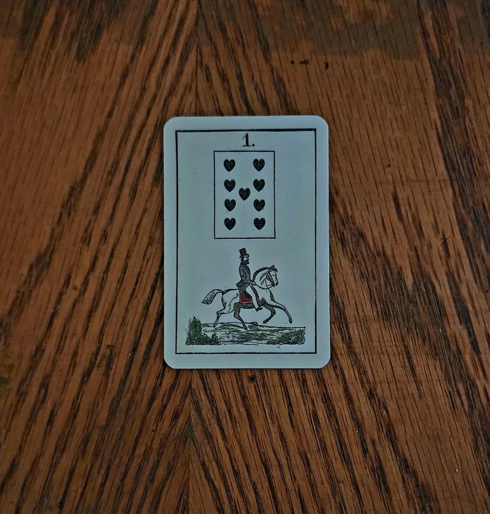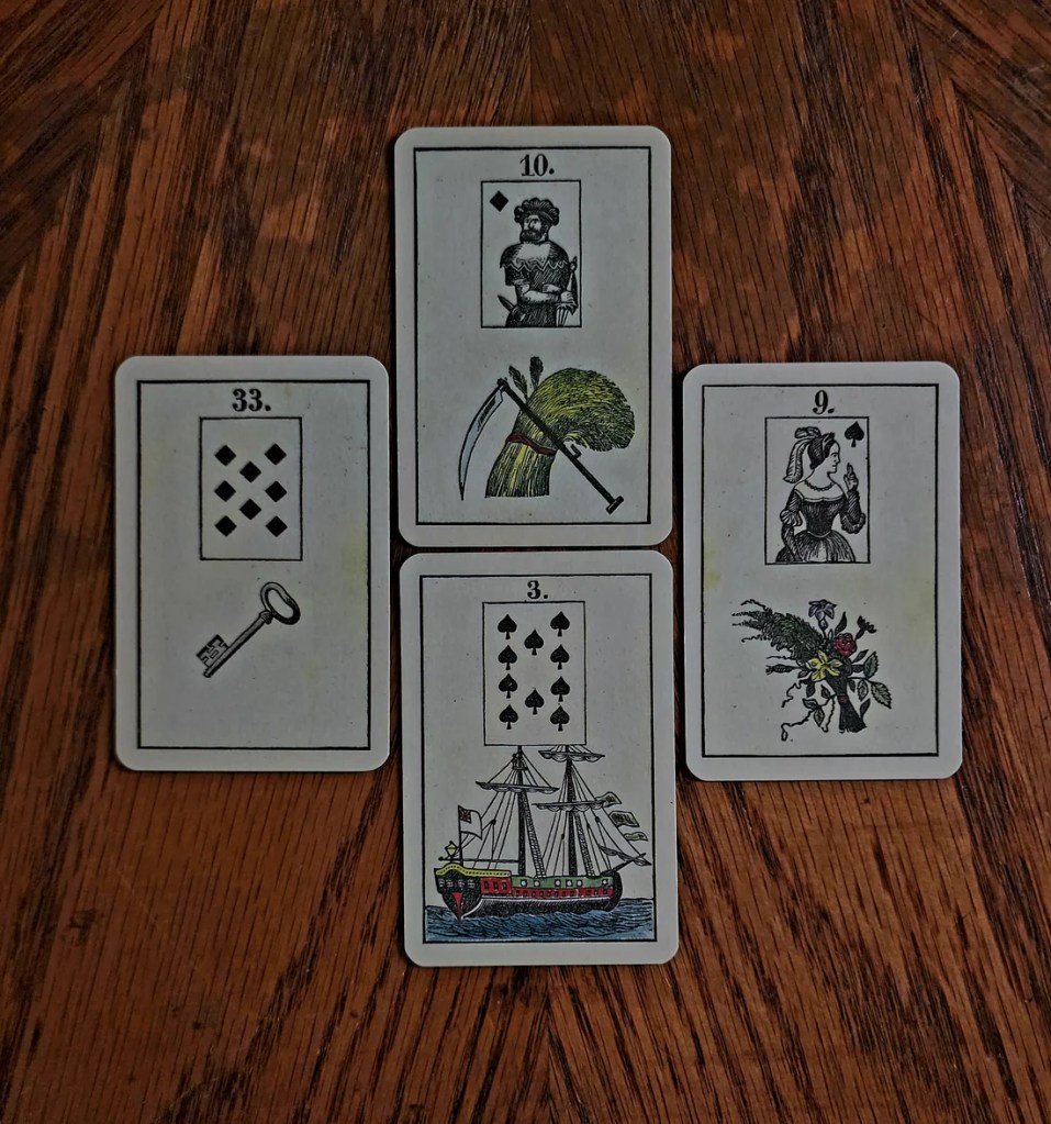I offer an array of personally developed card spreads using Lenormand Cards to look into a single question on the behalf of the client—ranging from a 1 card pull, to 9 card tableau.