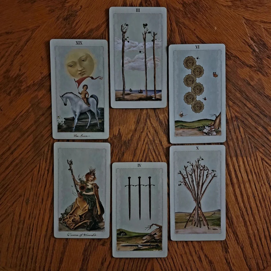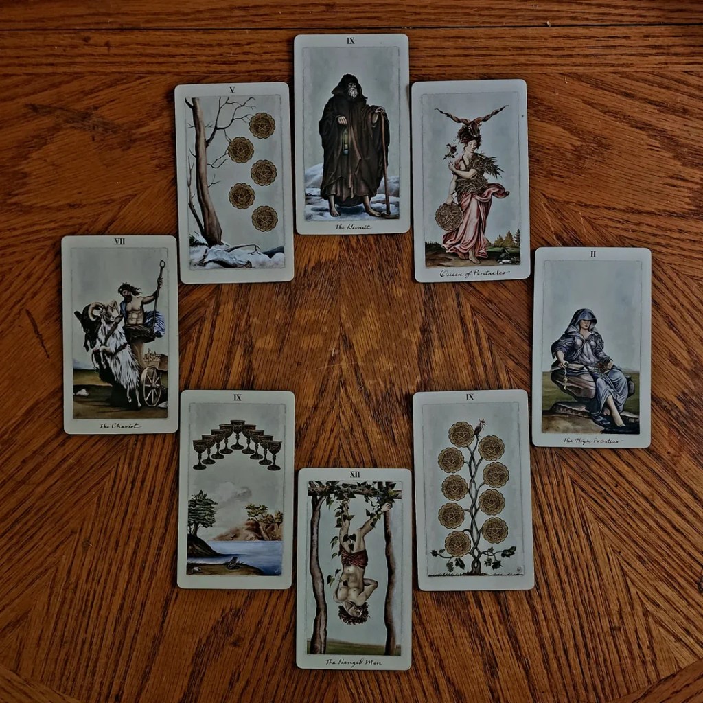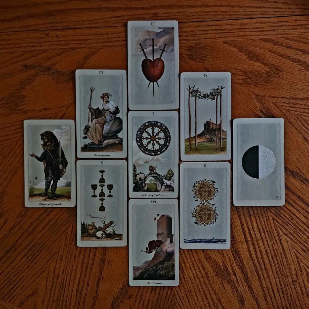I offer an array of personally developed card spreads using Tarot Cards to look into a single question on the behalf of the client—ranging from a 1 card pull, to 9 card tableau.