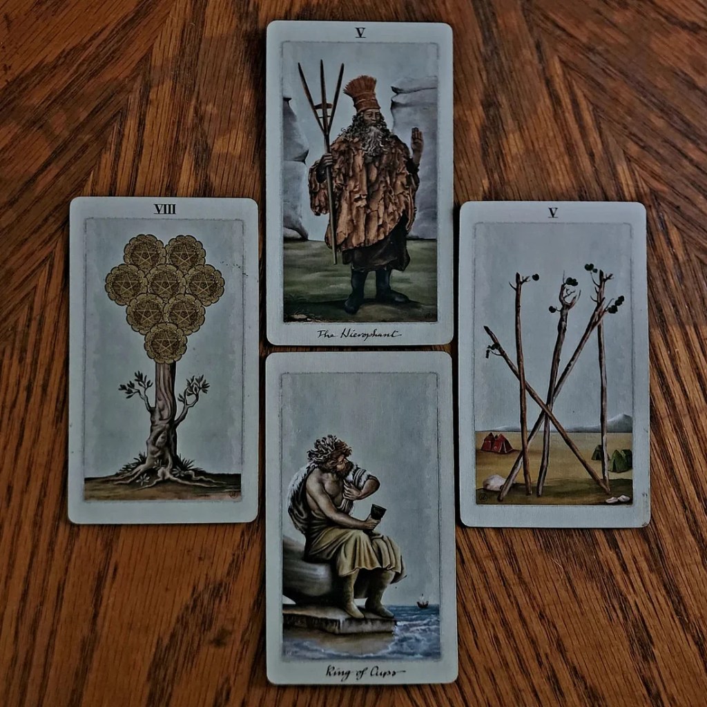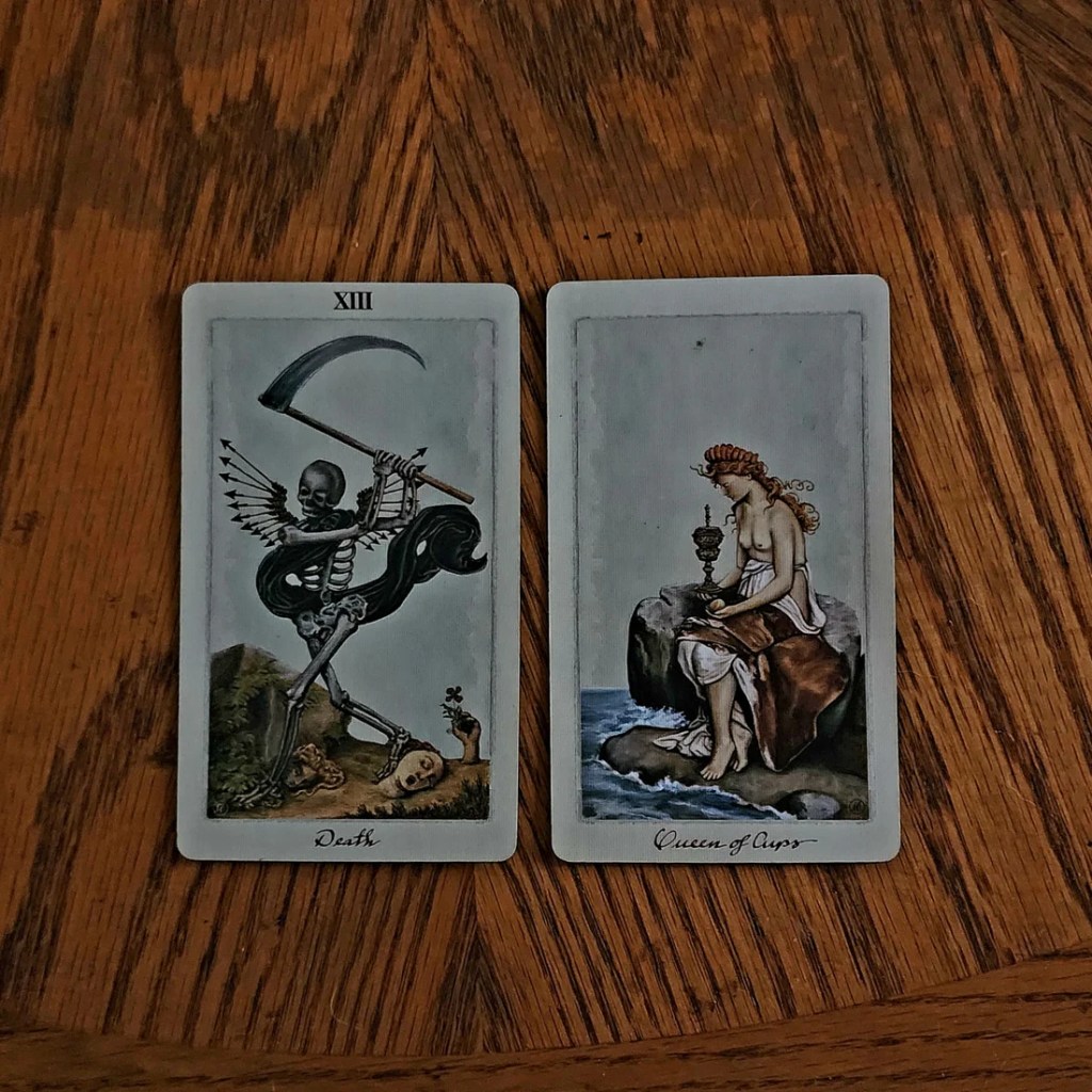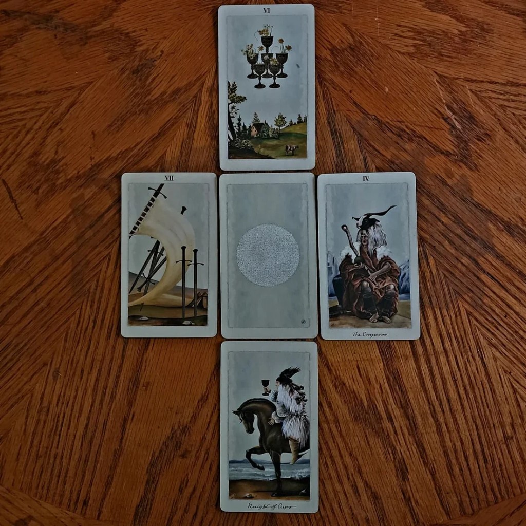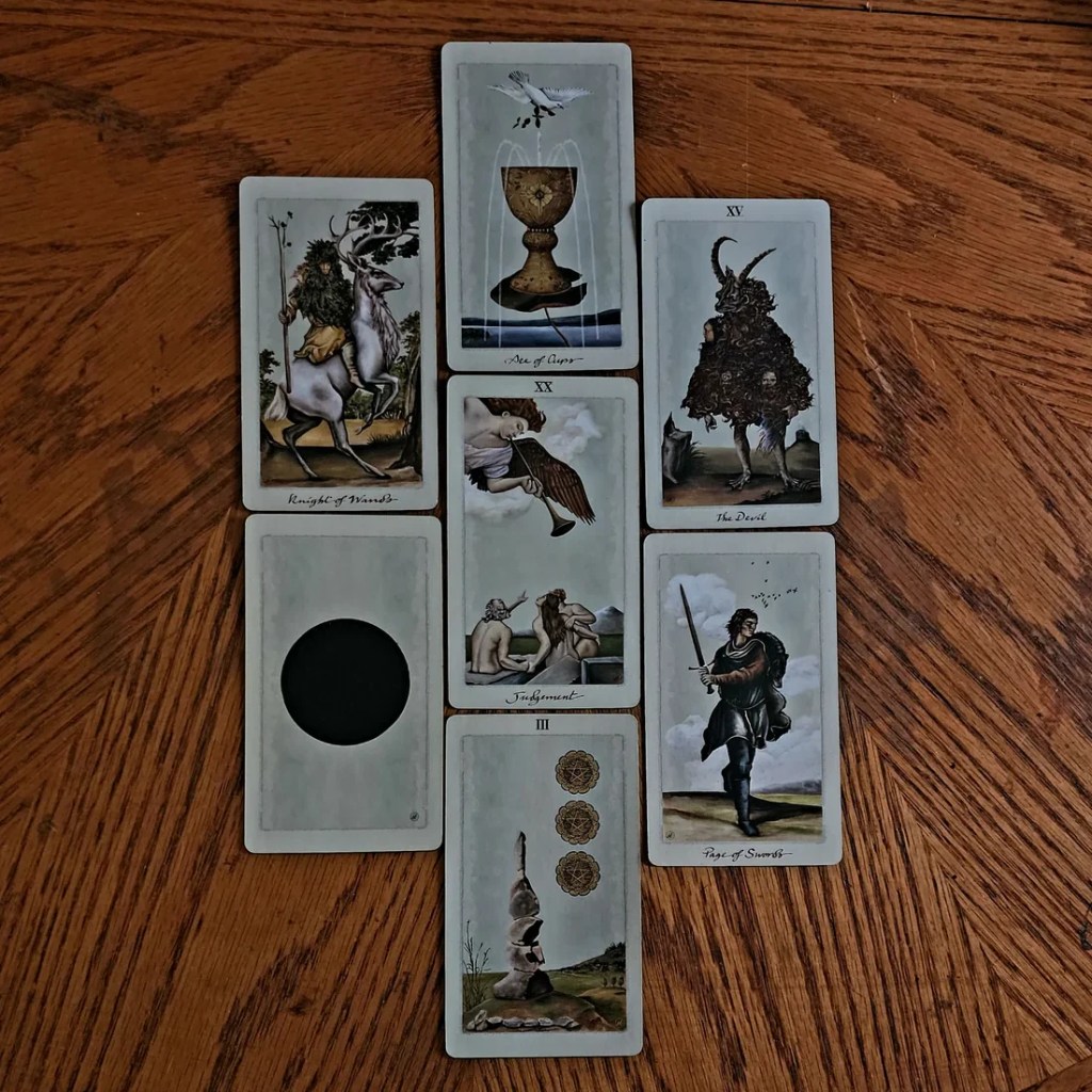 I offer an array of personally developed card spreads using Tarot Cards to look into a single question on the behalf of the client—ranging from a 1 card pull, to 9 card tableau.